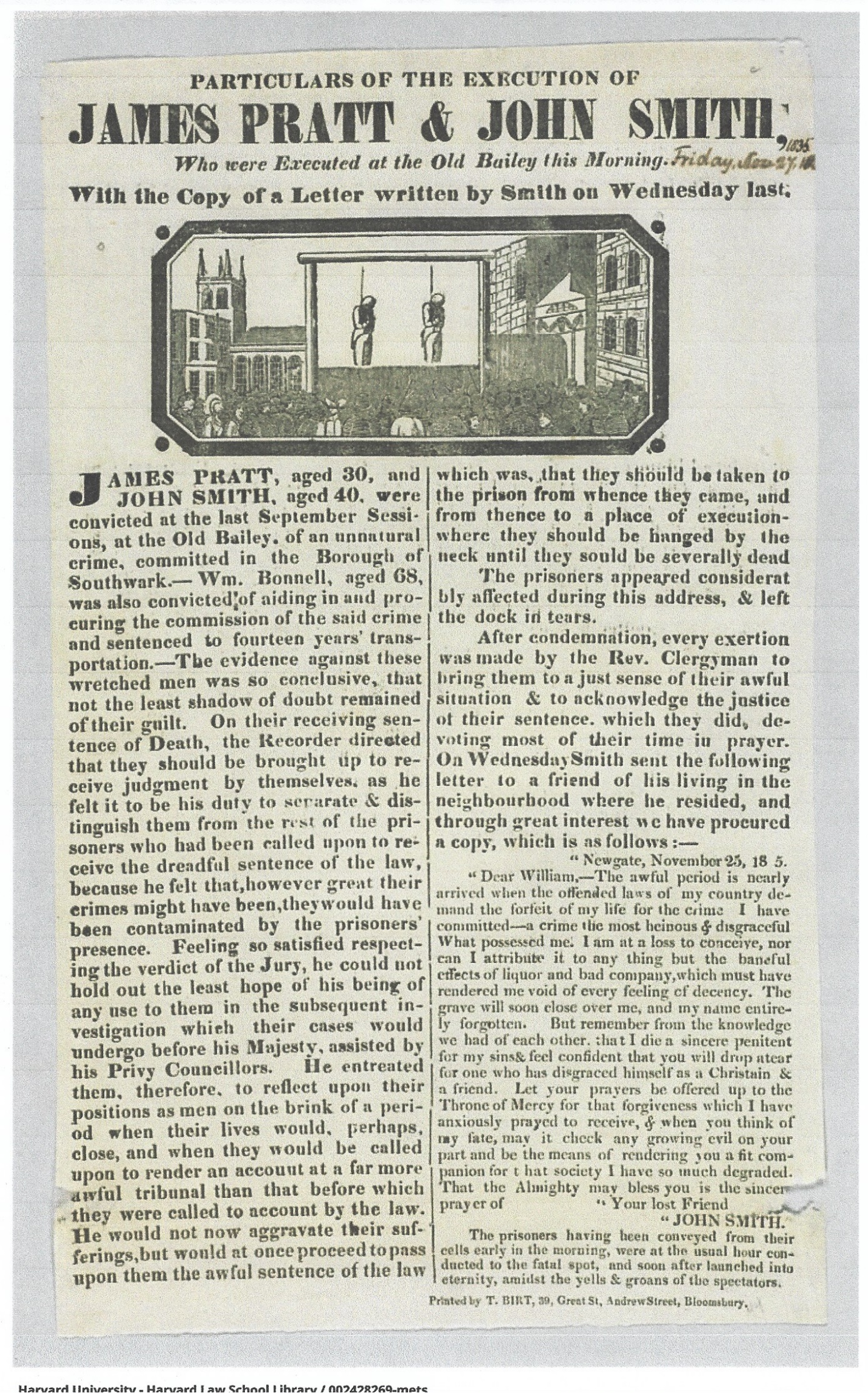 The last two men to be hanged for homosexuality in the UK were John Smith & John Pratt in November 1835. They were convicted under section 15 of the Offences Against the Person Act 1828, which had replaced the Buggery Act. They were hanged at Newgate Prison, London. They were posthumously pardoned in 2017 under ‘Turing’s Law.’